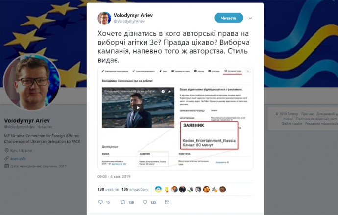 «Шикарно, покажите это сторонникам Зеленского. Владельцем видеоконтента Зеленского является Кремль! Компания „Kedoo_Entertainment_Russia“ является партнером канала „60 минут по горячим следам“. Именно эти два партнера указаны авторами прав на видео Зеленского! Проверил на собственном ютуб-канале!» — написал он.